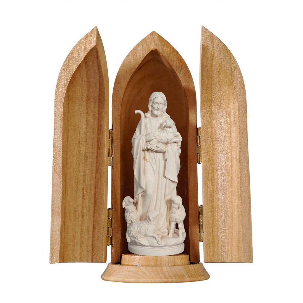 Drevená socha Ježiša dobrého pastiera v kaplnke je nádherne vyrezaná z javorového dreva, ručne maľovaná jemnými olejovými farbami a zlátená plátkovým zlatom.