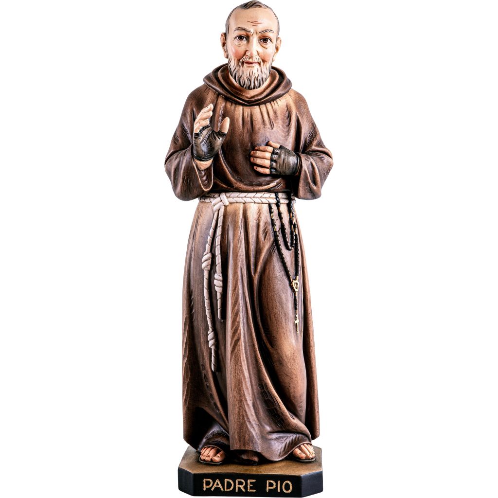Drevená socha Pátera Pia je vyrezaná z masívneho dreva, nádherne maľovaná jemnými olejovými farbami a zlátená plátkovým zlatom. Dostupná vo farbe, alebo prevedení natur (prírodné drevo) v rôznych veľkostiach.