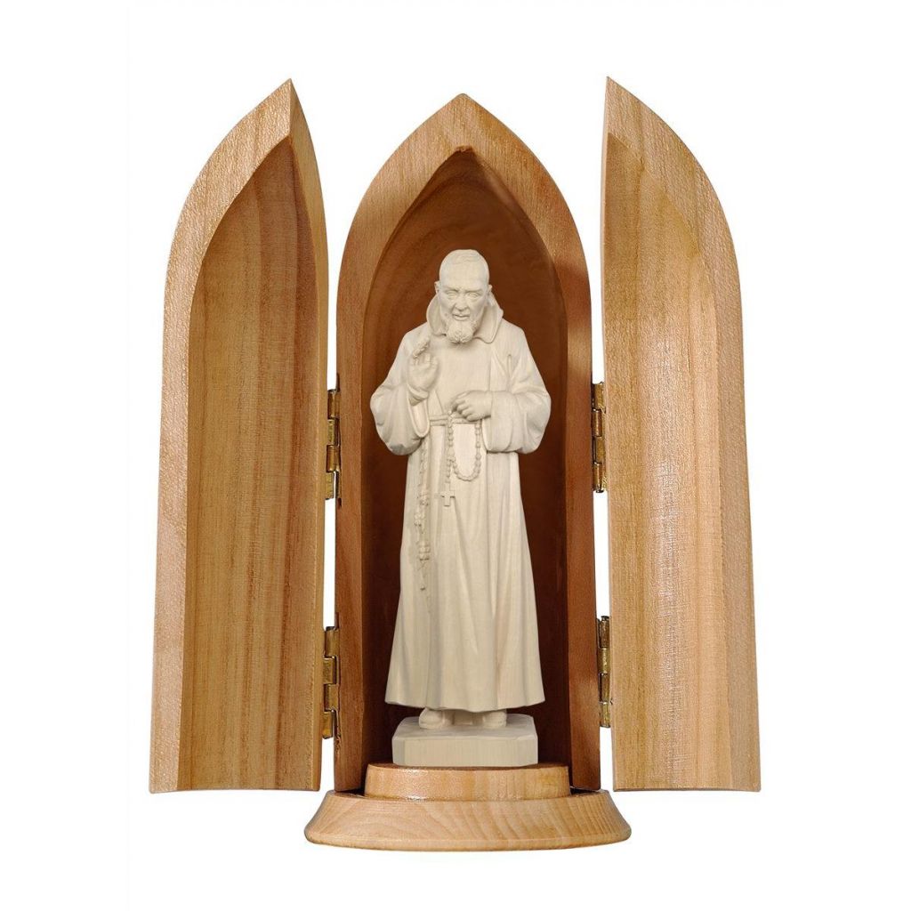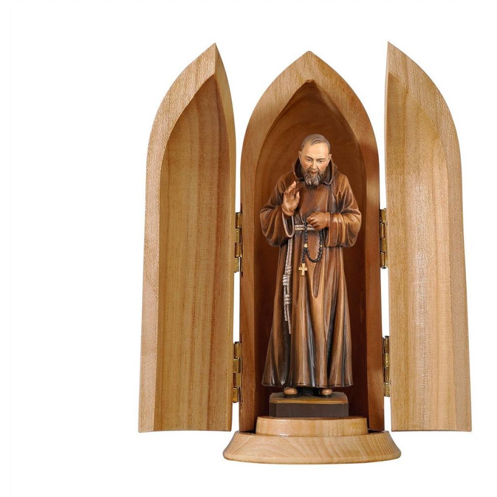 Drevená socha Pátera Pia v kaplnke je nádherne vyrezaná z javorového dreva, ručne maľovaná jemnými olejovými farbami a zlátená plátkovým zlatom.