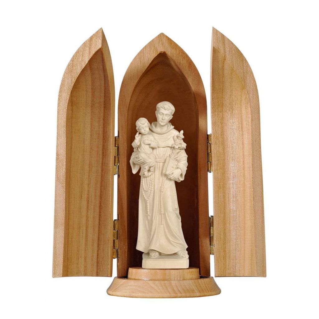 Drevená socha Svätého Antona s dieťaťom v kaplnke je nádherne vyrezaná z javorového dreva, ručne maľovaná jemnými olejovými farbami a zlátená plátkovým zlatom.