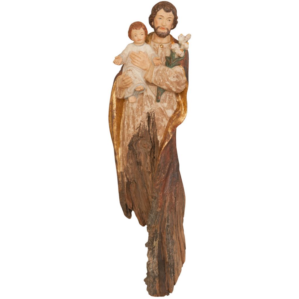 Drevená socha Svätý Jozef a dieťa je nádherne vyrezaná z koreňového dreva, ručne maľovaná jemnými olejovými farbami a zlátená plátkovým zlatom. Dostupná vo farbe v rôznych veľkostiach.