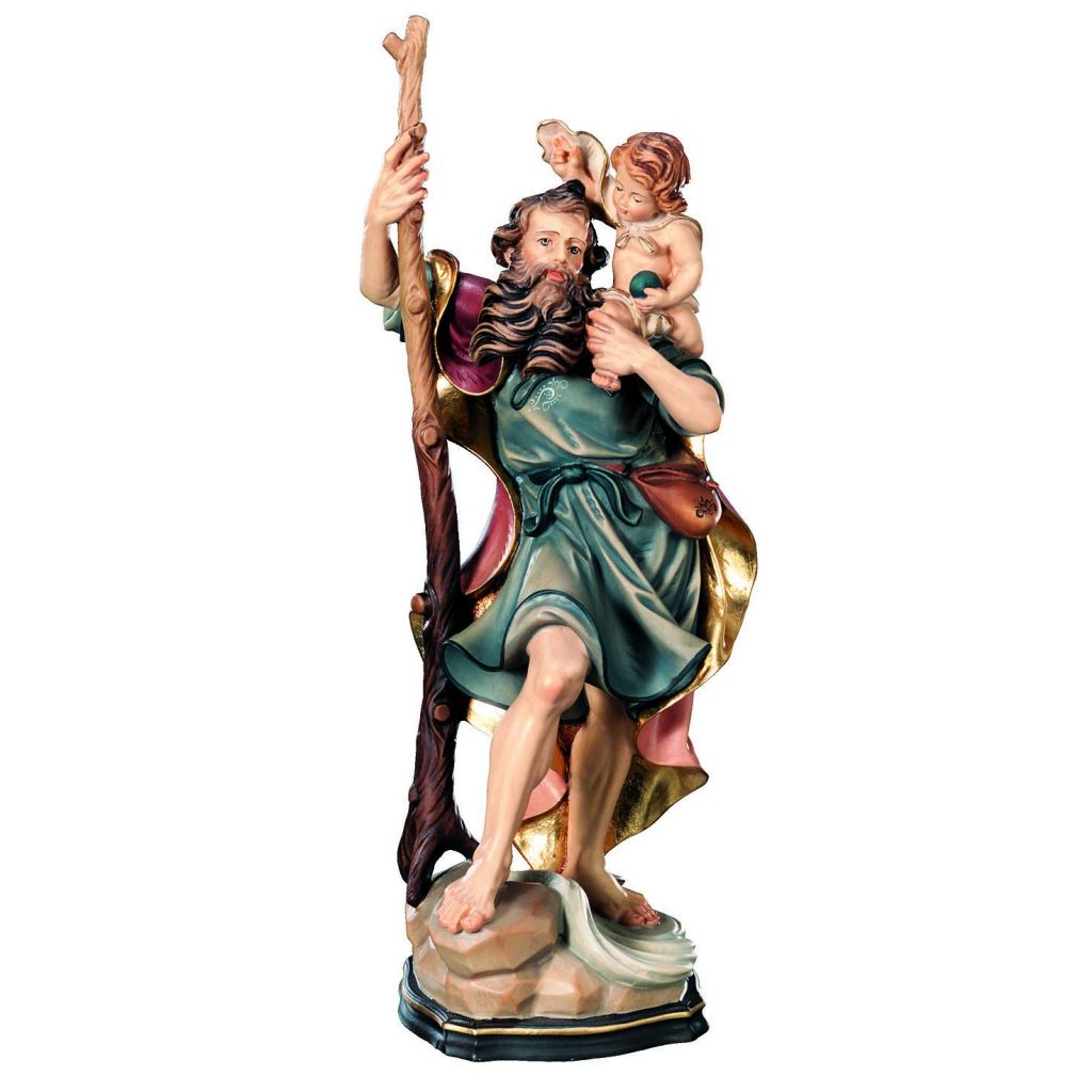 Drevená socha Svätého Krištofa s dieťaťom je vyrezaná z javorového dreva a nádherne maľovaná jemnými olejovými farbami , zlátená plátkovým zlatom. Dostupná vo farbe, alebo prevedení natur (prírodné drevo) v rôznych veľkostiach.