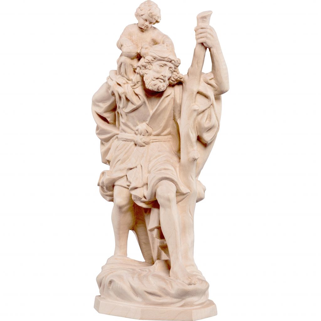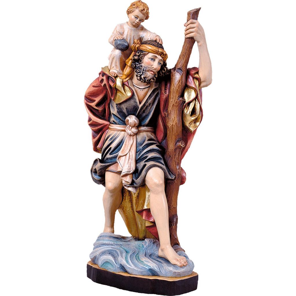 Drevená socha Svätého Krištófa v kolinskej katedrále je vyrezaná z masívneho dreva, nádherne maľovaná jemnými olejovými farbami a zlátená plátkovým zlatom. Dostupná vo farbe, alebo prevedení natur (prírodné drevo) v rôznych veľkostiach.