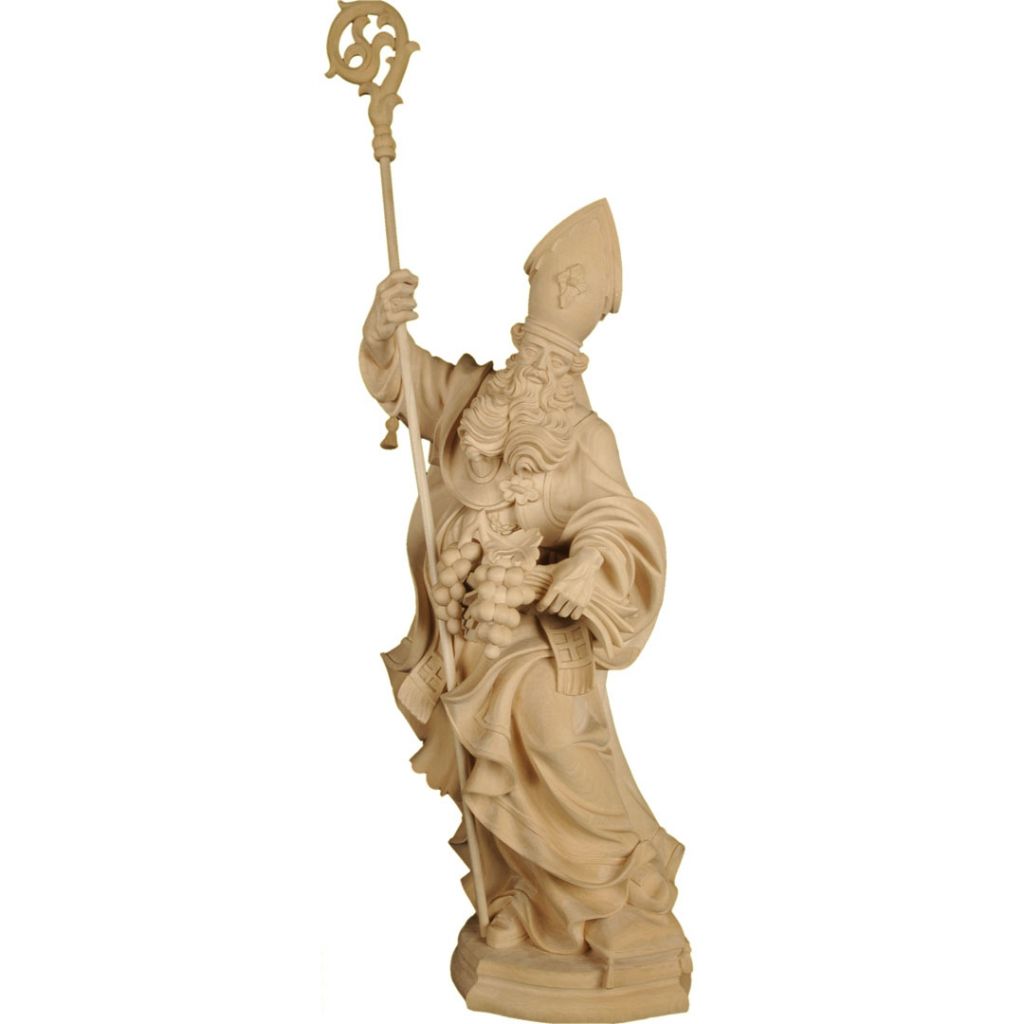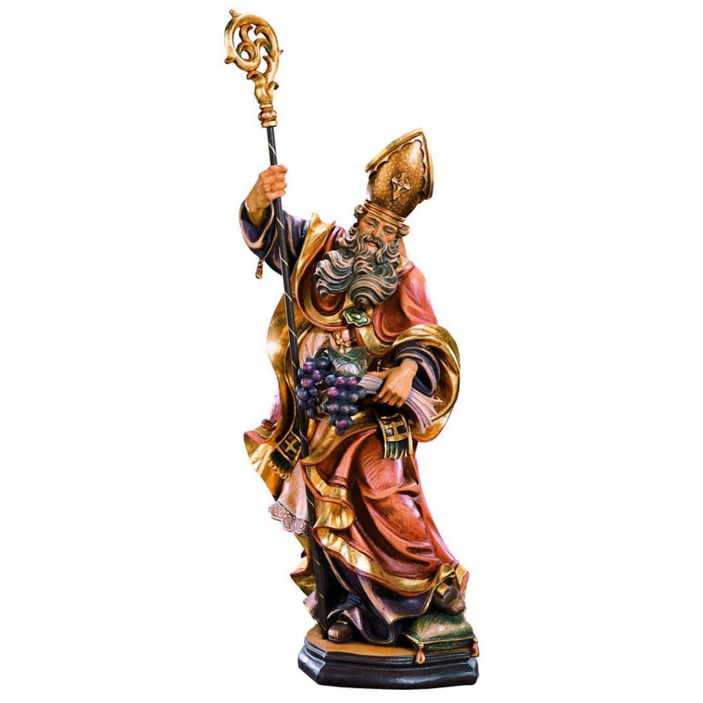 Drevená socha Svätého Urbana s hroznom je nádherne vyrezaná z javorového dreva, ručne maľovaná jemnými olejovými farbami a zlátená plátkovým zlatom.